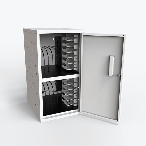 The durable steel material also ensures that this unit will last a long time. The Luxor LLTMWV12-G has two shelves and a single vertical power strip that accommodates the charging needs of all 12 devices. Both shelves have rubber-coated dividers that organize the tablets or Chromebooks and protect them from scratches and damage. This charging box also features ventilated sides for constant airflow, preventing the devices from overheating.