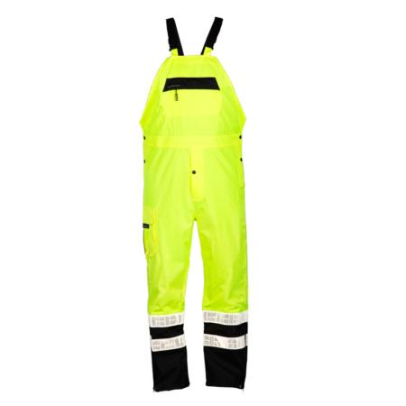 ML Kishigo brilliant series rainwear bib. Comfortable water proof material with durable seam sealed construction. 2-inches wide reflexite prismatic reflective tape performs exceptionally well under wet conditions, and provides additional durability over silver glass beaded reflective materials. High quality elastic suspenders with quick release buckle. Adjustable leg cuff straps. Front fly with snap closure. Zipper at bottom leg for boot access. Large patch pocket with zipper/storm flap. Right side cargo pocket, grommets at the bottom of cargo pocket for water drainage. ANSI/ISEA 107 class E compliant.