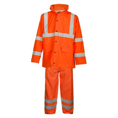 ML Kishigo economy durable seam sealed High-Viz full rain suit. Water proof material with durable seam sealed construction. 2-inches Wide silver reflective material. Zipper/storm flap closure for weather protection. Non-sparking snaps and zipper. Adjustable wrist cuffs. Lower front patch pockets. Adjustable leg cuff straps. ANSI/ISEA 107 class 3 compliant.