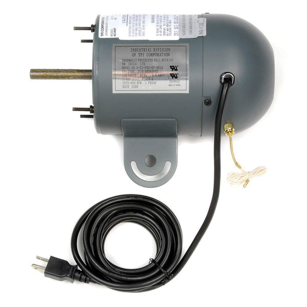 With an SJT type 3 conductor cord and three-prong plug for grounded electric outlets, this fan motor can be used in distances of up to 12 feet. This industrial fan motor is compatible for use with TPI industrial fan circulator heads that bear a .5-inch diameter shaft.
