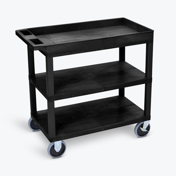 Product Luxor 18" x 32" 2-Flat/1-Tub Heavy-Duty Shelf Cart 32"W x 18"D x 35.5"H (Black) - EC122HD-B Luxor 42" 3-Shelf Tuffy AV Cart with Electric Assembly, Black Cabinet & Legs (Navy Blue Shelves) - WT42ZC2E-B Luxor 3-Shelf Utility Cart 24"W x 18"D x 43"H (Blue) - HE42-BU Luxor 32" x 24" 3-Shelf Large Tub Cart with Flat Top, Tub Middle & Bottom Shelves (Black) - TC211-B